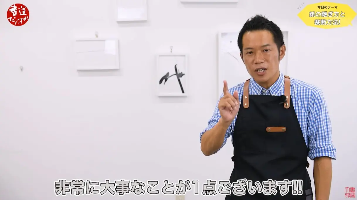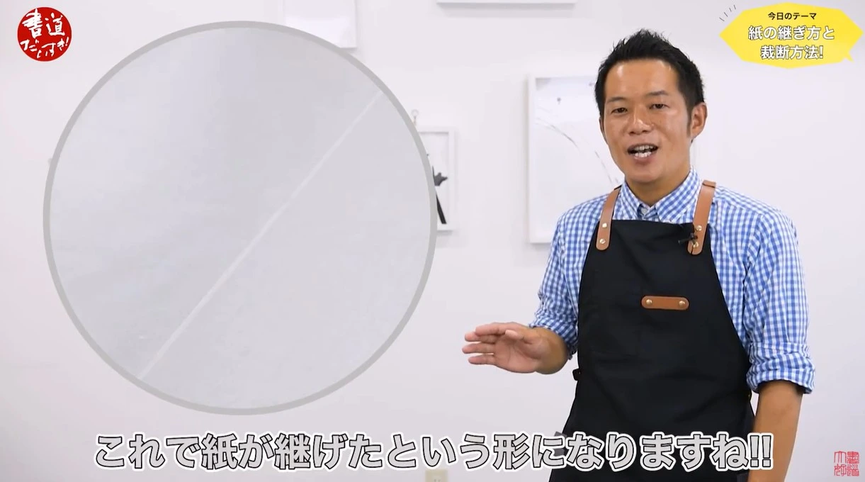 最後に、継いだ紙を使用する際の注意点として、のり付けした部分が筆に引っかからないよう、のりがついていない方の紙が上になるように使うこと、また紙の歪みを考慮して両サイドに余白を設けることの重要性を説明しました。