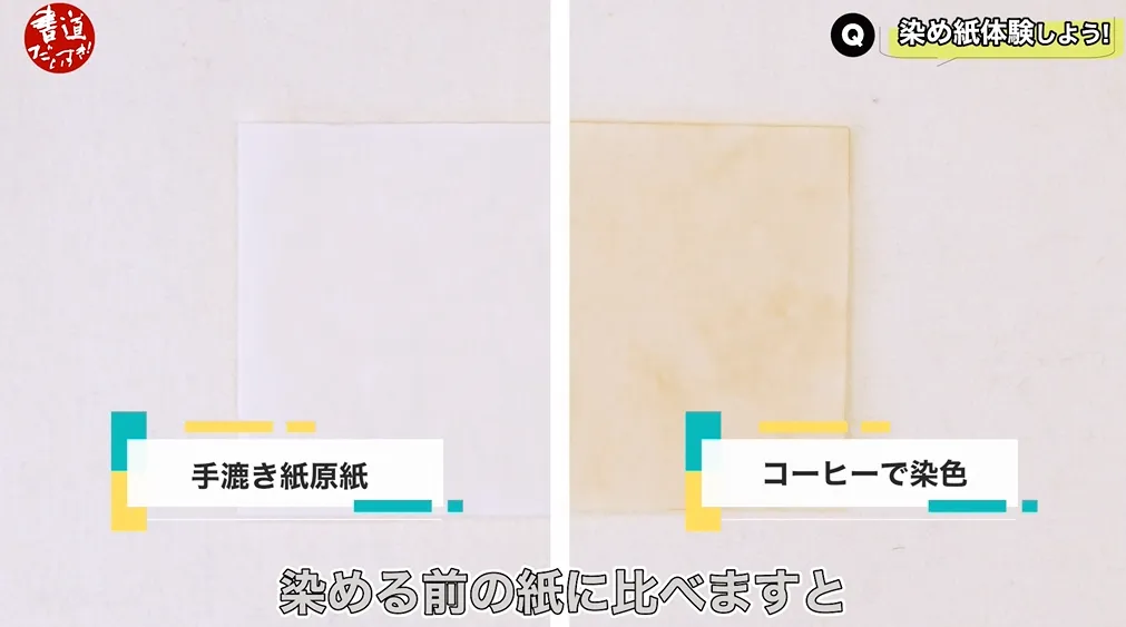 そして30分我慢して染めた紙ですね。これはやはりですね。染める前の紙と比べましたら、じっくりと味わい深い色になったのではないでしょうか。やはり、手すきの紙と機械漉きを比べますと、丈夫なのは圧倒的に機械漉きの紙ですね。