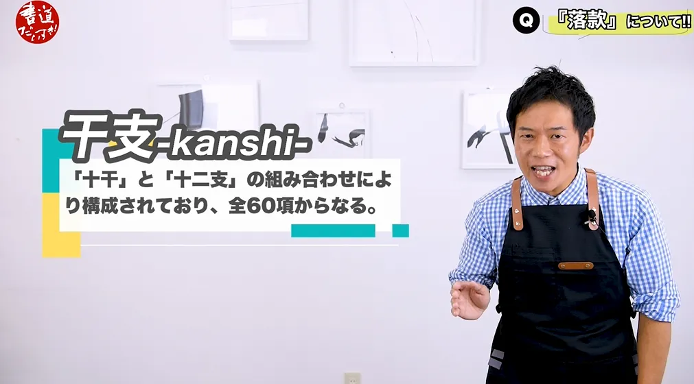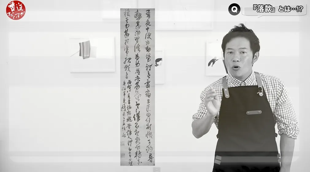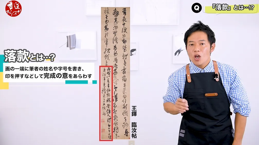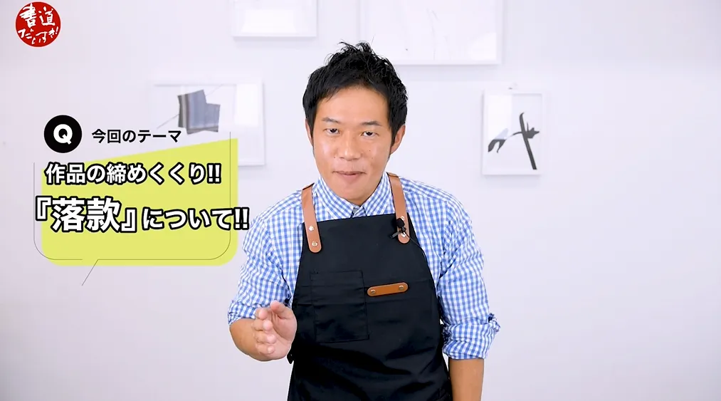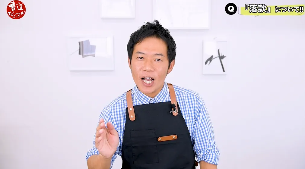 しまうち氏による「落款(らっかん)」についての解説講座です。落款とは書画作品の左端に記される署名や制作年月日などの情報のことで、元々は「落成款識」という言葉の略であると説明されています。落成は書画の完成を意味し、款識は署名捺印を指します。