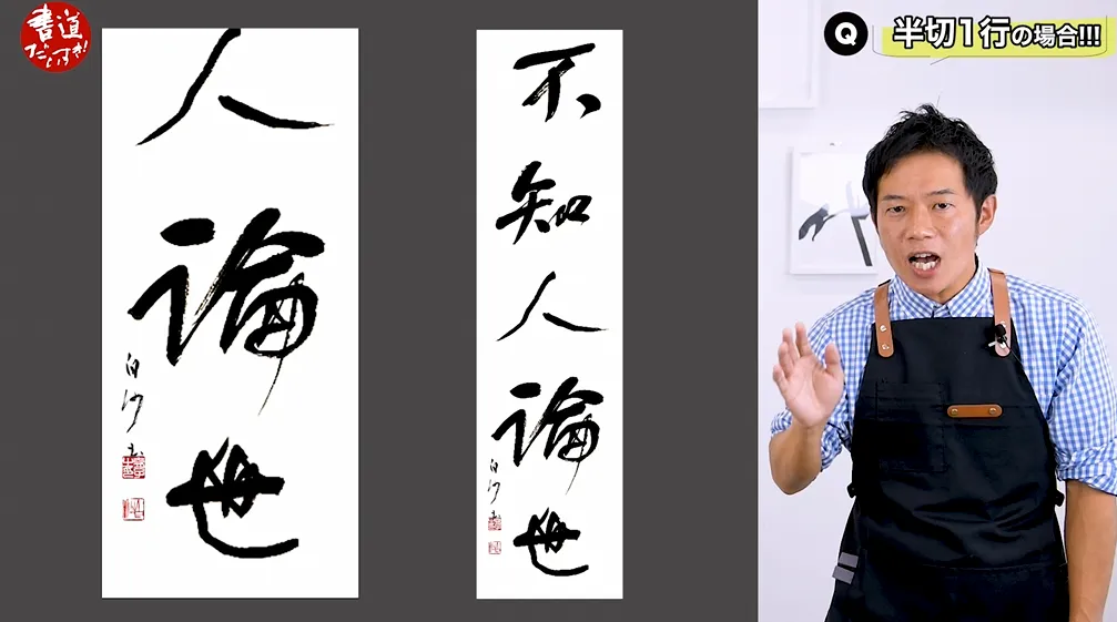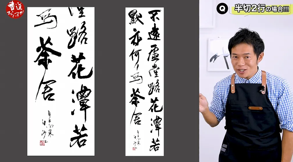 また、落款の位置と形式についても説明があり、半切作品を例に挙げて、落款を入れる位置やバランスについての考え方が示されています。基本的には本文は紙の中央に、落款は左側のやや上寄りに書くことが原則とされていますが、作品に合わせて調整することの重要性も強調されています。