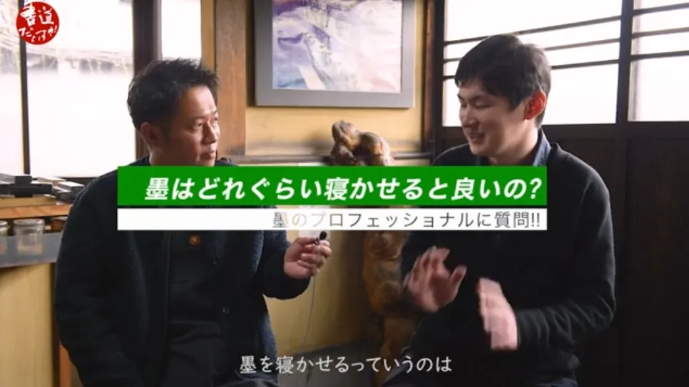 墨のすり方については、阿座上氏はしまうちの以前の動画での方法が正しいと確認し、基本的には濃い墨を作ってから水で薄めて使うことが重要だと強調しました。また、墨を「寝かせる」ことについては、保存状態の良い場所で4〜5年程度寝かせると使いやすくなると説明しています。