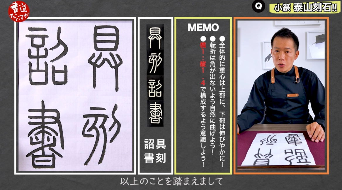 講師は実際に小篆の臨書実践を行い、「具」「刻」「招」「書」の4文字を書いて解説しています。