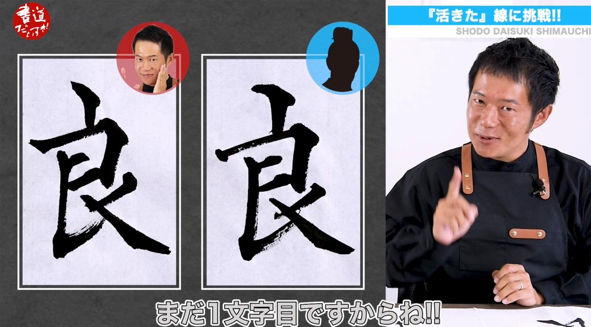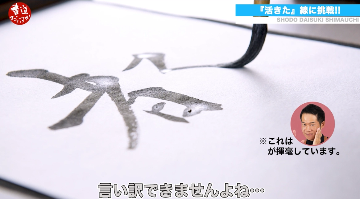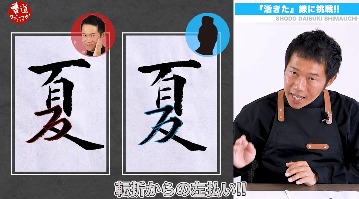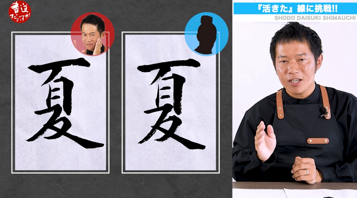 しまうち氏は、書道の上達には師匠の動きをすべて観察することの重要性を強調し、運筆の速度や筆圧の調整によって「活きた線」が生まれることを説明しています。