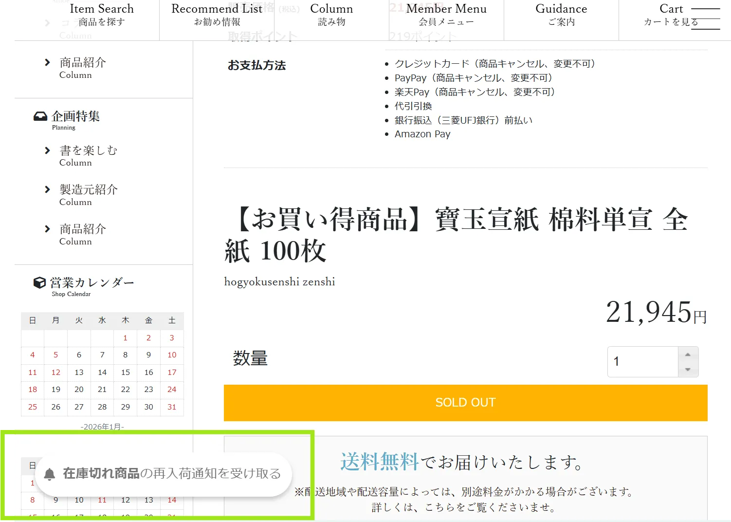 欠品中(SOLD OUT)の商品については、表示画面左下に、再入荷お知らせ登録ができるボタンが表示されます。