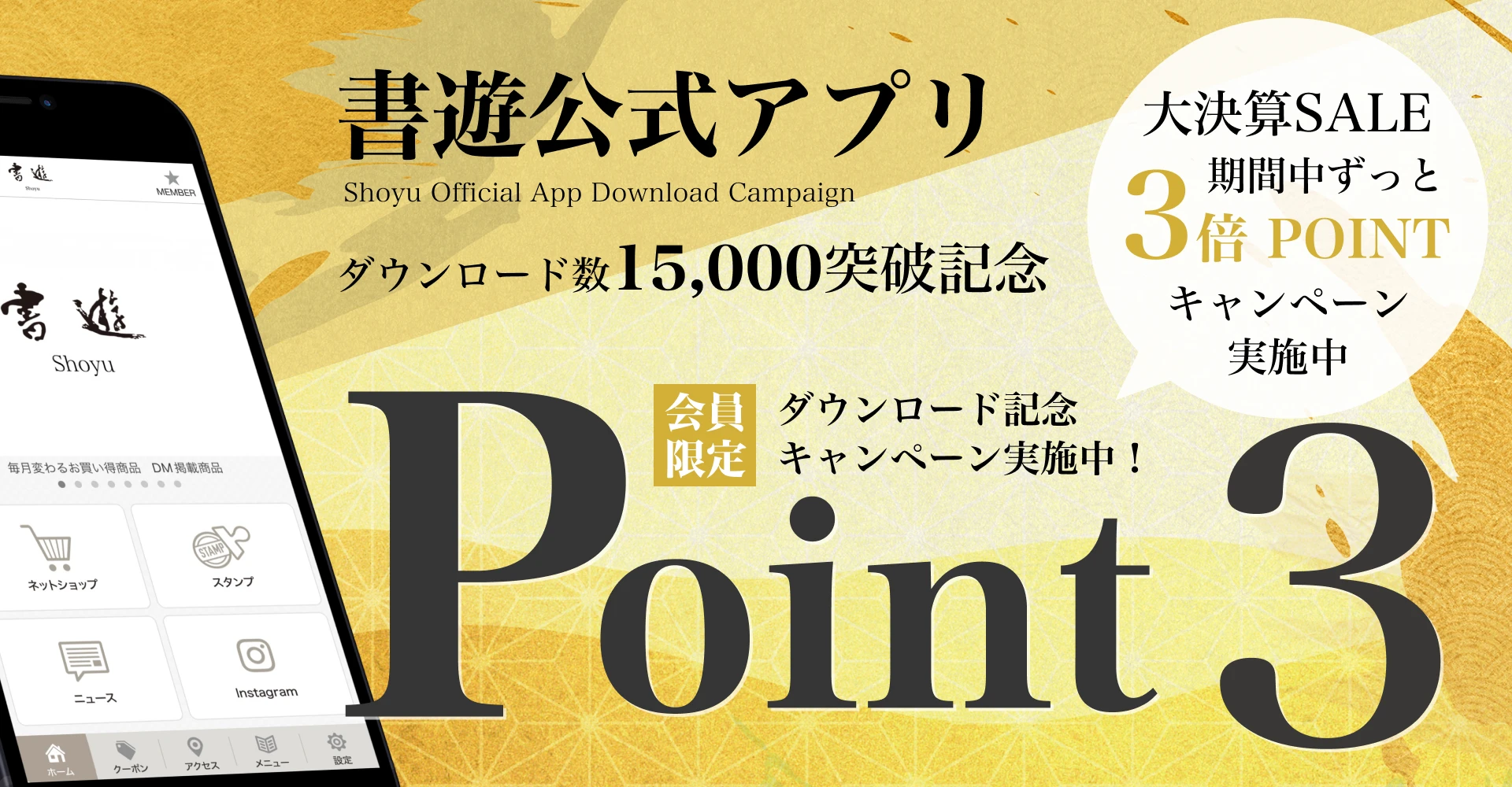 この度、書遊公式アプリのダウンロード数が15,000を突破した記念にポイントUpキャンペーンを実施いたします。